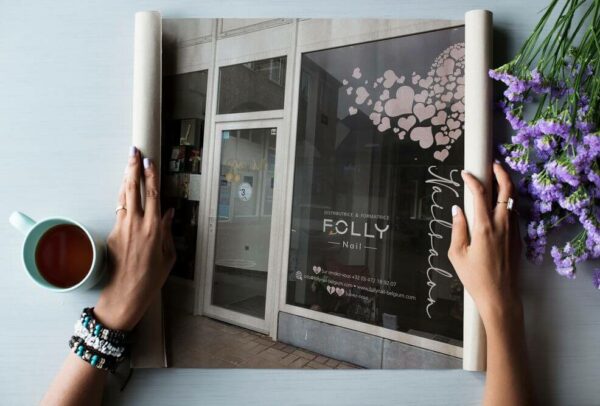 Lettrage de la vitrine du salon Folly Nails à Bastogne